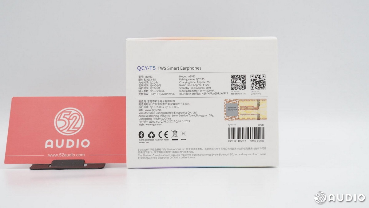 包裝盒背面是一組中英文對(duì)照的產(chǎn)品信息,主要內(nèi)容有:QCY T5 TWS藍(lán)牙耳機(jī),型號(hào)In1933,音樂(lè)播放時(shí)間約4-5小時(shí),輸入?yún)?shù)5V?500mA,支持協(xié)議:HSP/HFP/A2DP/AVRCP,制造商:東莞市和樂(lè)電子有限公司。此外還有一些認(rèn)證信息和防偽查詢信息等。