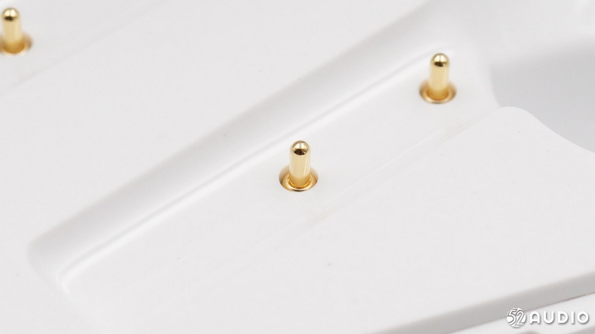 充電銅柱特寫(xiě)。與充電盒的頂針接觸后,充電盒電池就會(huì)給耳機(jī)電池供電,銅柱上有密封圈,防止液體進(jìn)入。