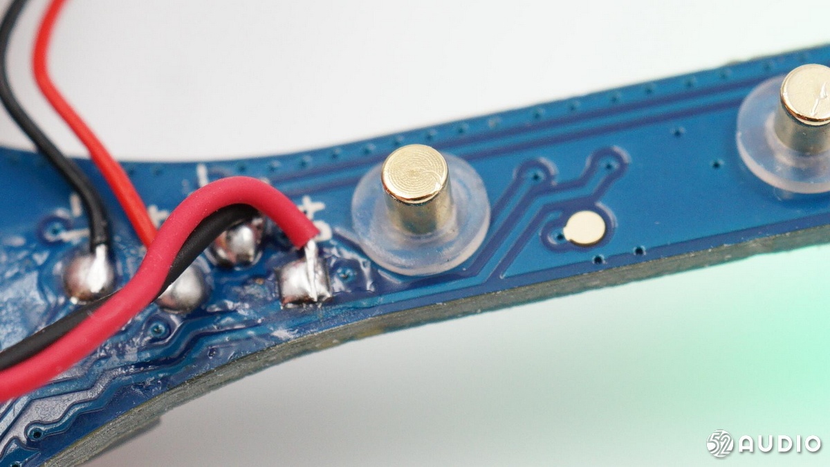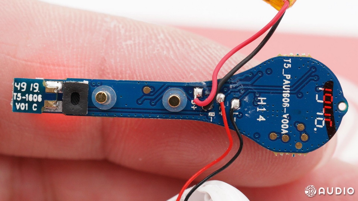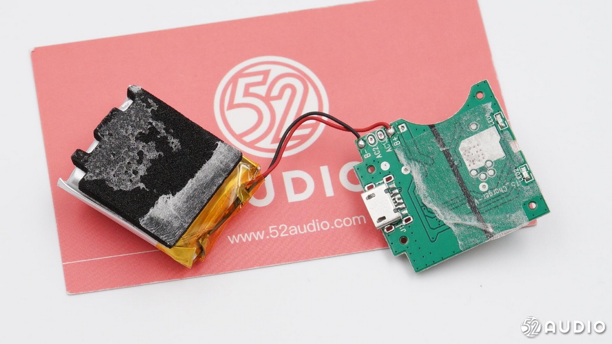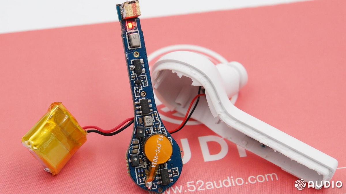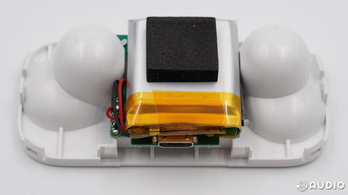 耳機(jī)內(nèi)部電路一覽,電池和揚(yáng)聲器通過(guò)導(dǎo)線連接至主板。