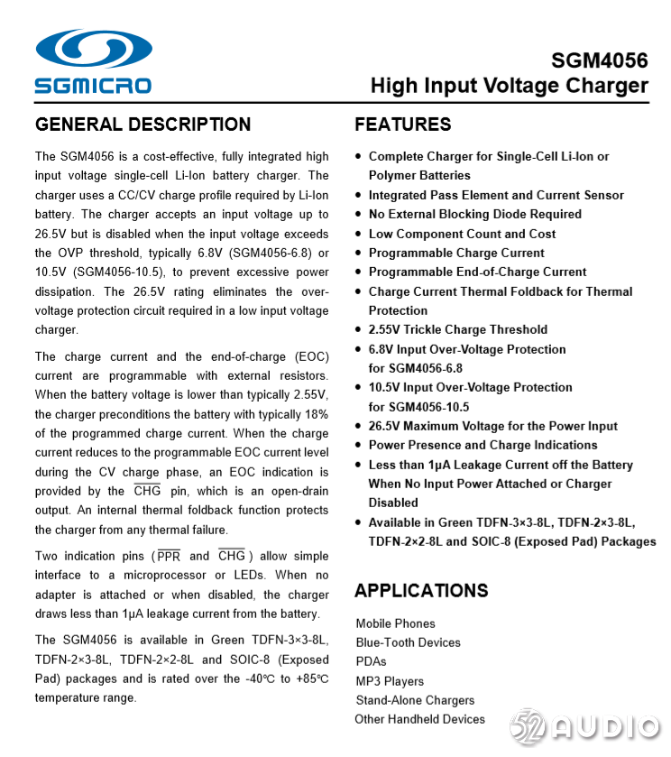 圣邦威SGM4056 線性充電IC,內(nèi)置過(guò)壓保護(hù),最高耐壓26.5V,并且有6.8V過(guò)壓保護(hù),可以省去外部過(guò)壓保護(hù)元件。
