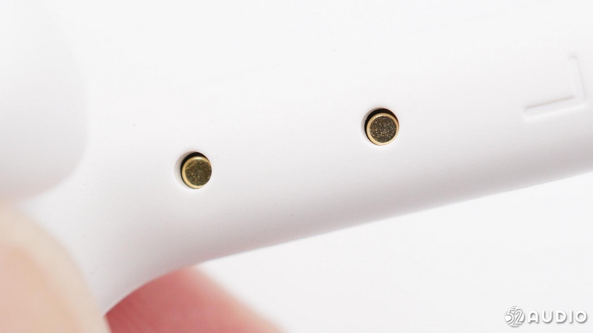 耳機(jī)柄內(nèi)側(cè)的充電觸點(diǎn),分得比較開(kāi)。