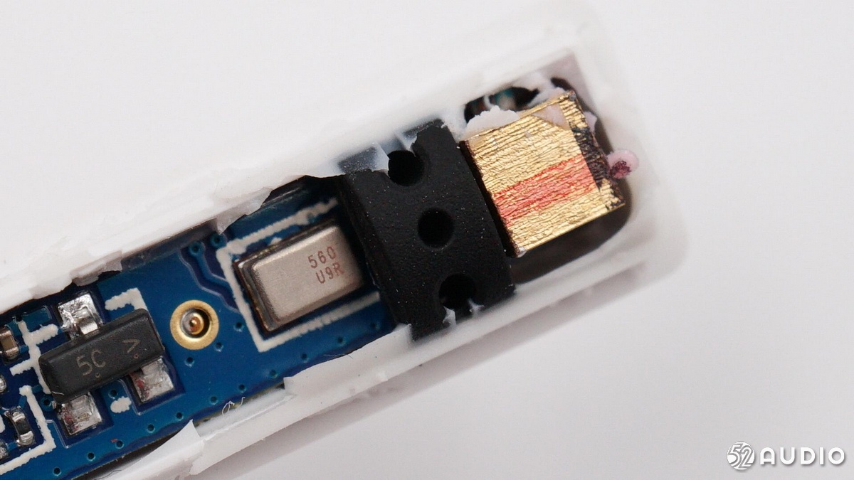 耳機(jī)部分,QCY T5 與T4一樣采用了原相 PAU1606FB-S1藍(lán)牙音頻SoC,支持藍(lán)牙5.0,其GeendRadio?立體聲技術(shù),具有左右耳快速切換、低延遲的特點(diǎn),被很多“游戲TWS”耳機(jī)采用。并且該芯片內(nèi)置鋰離子電池充電器,確保耳機(jī)電池的充電安全;耳機(jī)內(nèi)的軟包電池容量為43mAh,與T4一樣。耳機(jī)采用疊層貼片藍(lán)牙天線收發(fā)藍(lán)牙信號(hào)。