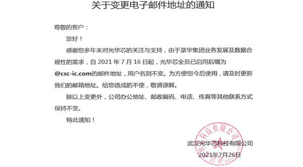 尊敬的客戶:您好!感謝您多年來對光華芯的關(guān)注與支持,由于菉華集團業(yè)務發(fā)展及數(shù)據(jù)合規(guī)性的需求,自2021 年7 月16 日起,光華芯全員己啟用后綴為@csc-ic.com的郵件地址,用戶名則不變。為方便您今后使用,請及時更...